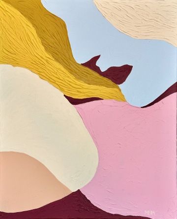 Meka Klimeková naopak pracuje s přírodou jako s krajinou paměti a emocí. Její malby, vytvořené technikou thick paint – tedy akrylem nanášeným špachtlí v hutných vrstvách – jsou vizuálními básněmi o harmonickém soužití člověka s přírodou. V kompozicích dominují čisté barevné plochy, jasná linie a důraz na texturu, které společně vytvářejí klidnou, meditativní atmosféru. Hory, které zobrazuje, někdy působí snově až symbolicky – jako by nesly otisk lidské přítomnosti, skrytý příběh nebo tichou vzpomínku. V každém díle je patrná snaha o vizuální rovnováhu, ale také osobní výpověď: její obrazy jsou terapií pro autorku a zároveň nositelem pozitivní energie pro diváka.