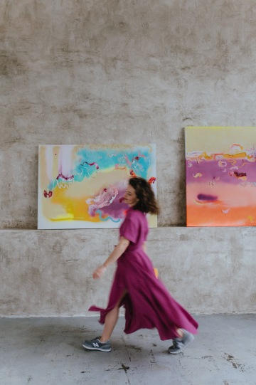 Mé umělecké začátky byly ryze ilustrátorské. Pracovala jsem jako tehdejší učitelka na ZŠ s kaligrafií a nonsensem, mám ráda situační humor a citáty. Ty jsem tehdy psala na hrnečky a tašky, k nim jsem dělala drobné ilustrace. To je zhruba 8 let zpátky. Z černobílých kreseb se časem staly barevné ilustrace a během COVIDu jsme tehdy s tříletou dcerou začaly tvořit abstraktní malbu na plátno, které jsem měla v ateliéru pro případ, kdybych někdy měla čas, až si to dovolím. Vývoj mé tvorby je lemován náhodami a okolnostmi. Od roku 2021 už se v mém ateliéru začínají objevovat první plátna. Tehdy také vznikla první kolekce Horizonty, která odstartovala několik dalších sérií abstraktních krajinomaleb.
