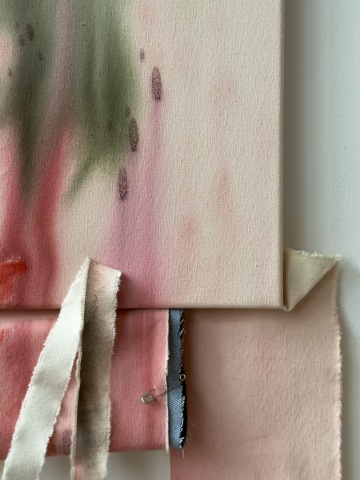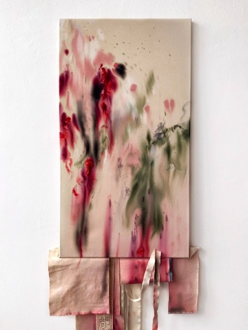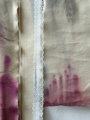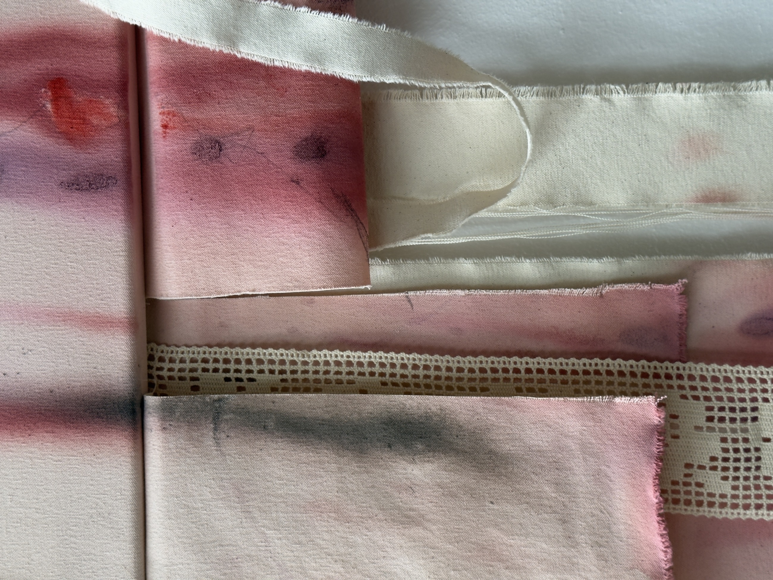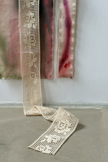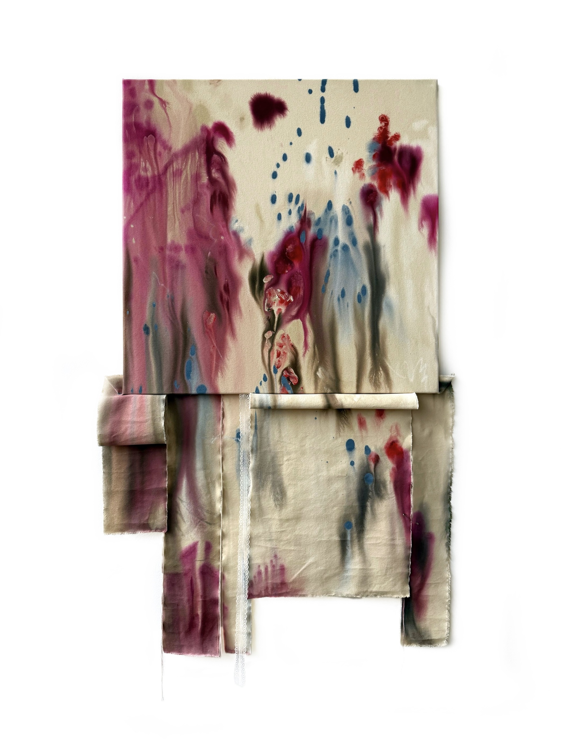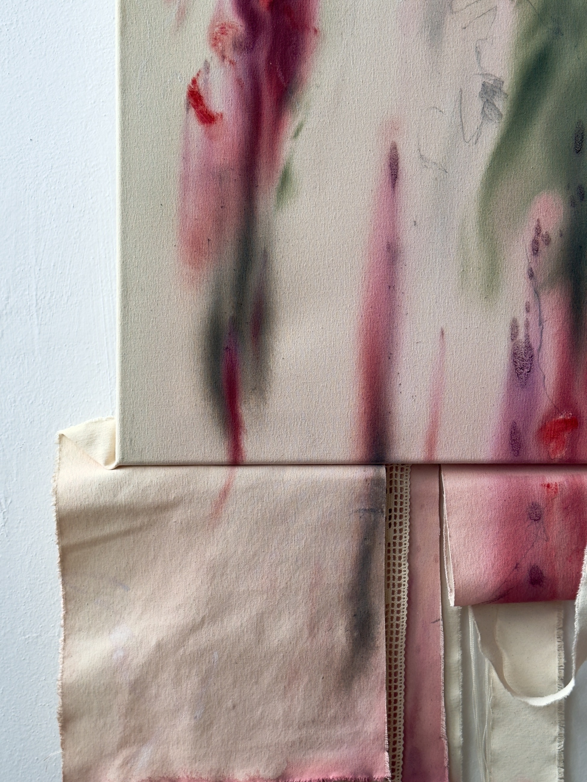 Charakteristická je pro ni práce s vrstvami a materiálem. Inkoust vpíjející se do surového plátna se nestává pouhým povrchovým prvkem – proniká dovnitř, stejně jako prožitek proniká pod kůži. Intuitivní linie pastelem či grafitem narušují strukturu a vnášejí napětí. Textilie, krajka, tyl nebo denim, často v kombinaci s technickými detaily, dodávají dílům hmatatelnost a fyzickou přítomnost. Výsledkem je křehká rovnováha mezi surovostí a jemností, mezi kontrolou a jejím vědomím uvolněním.