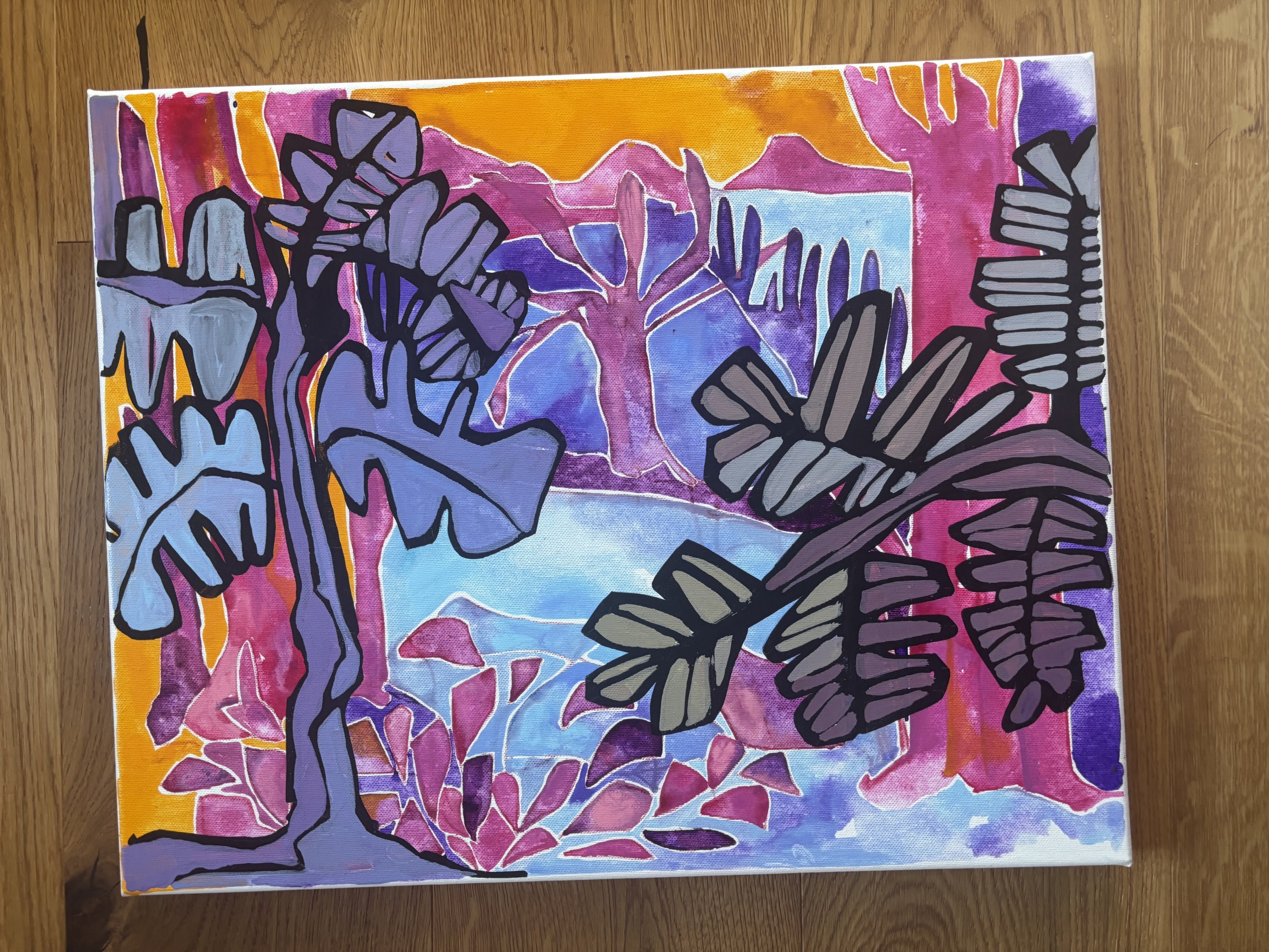 Její obrazy jsou explozí barev a energie, kde se setkávají růžová, modrá a žlutá s výraznými černými liniemi.