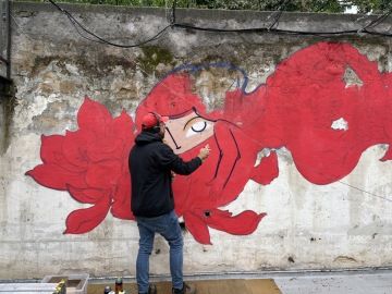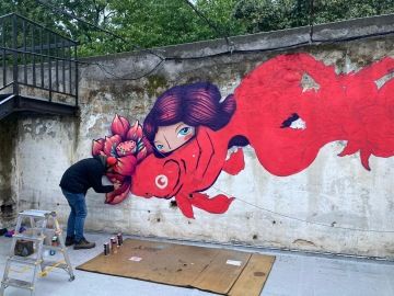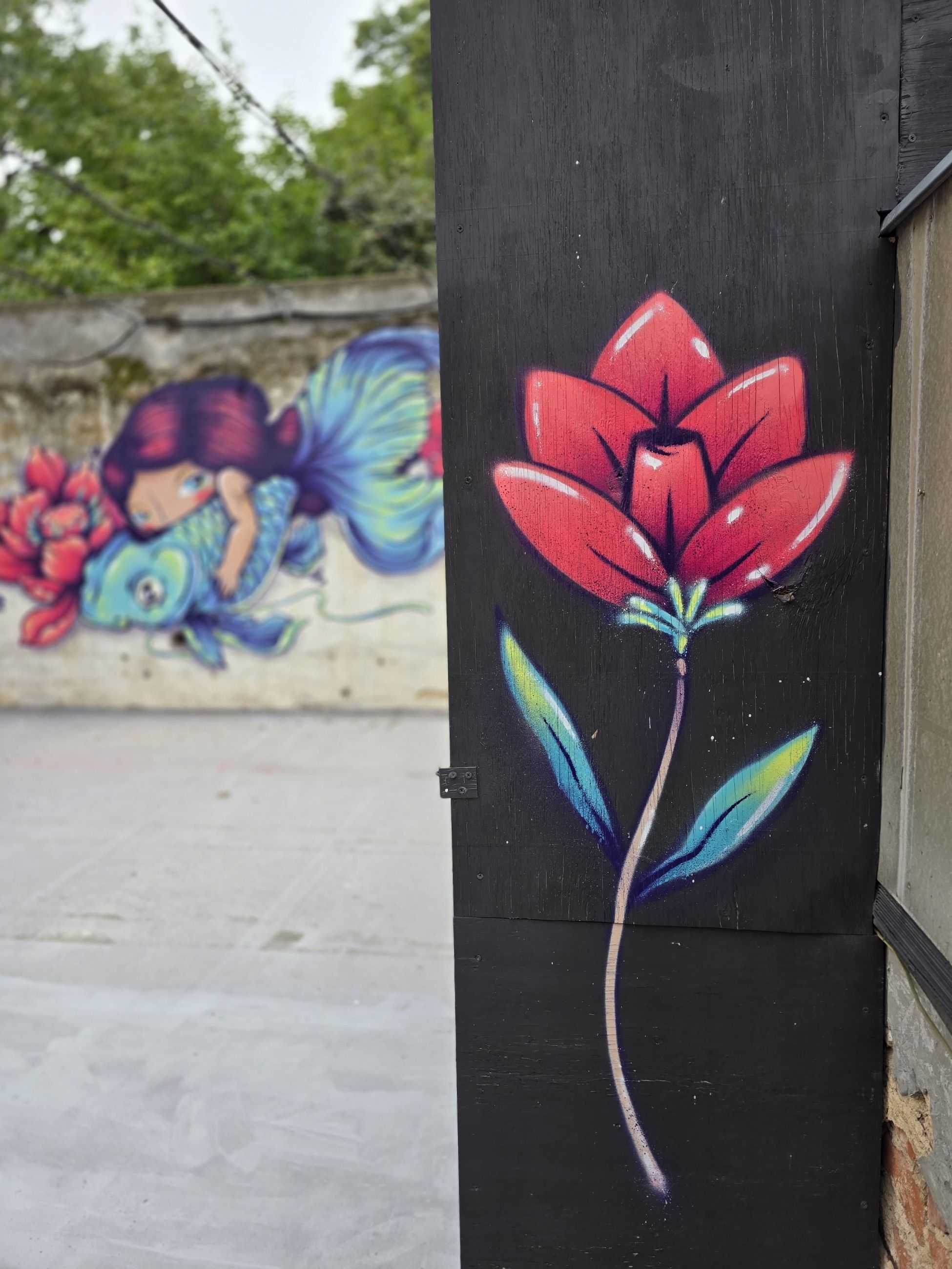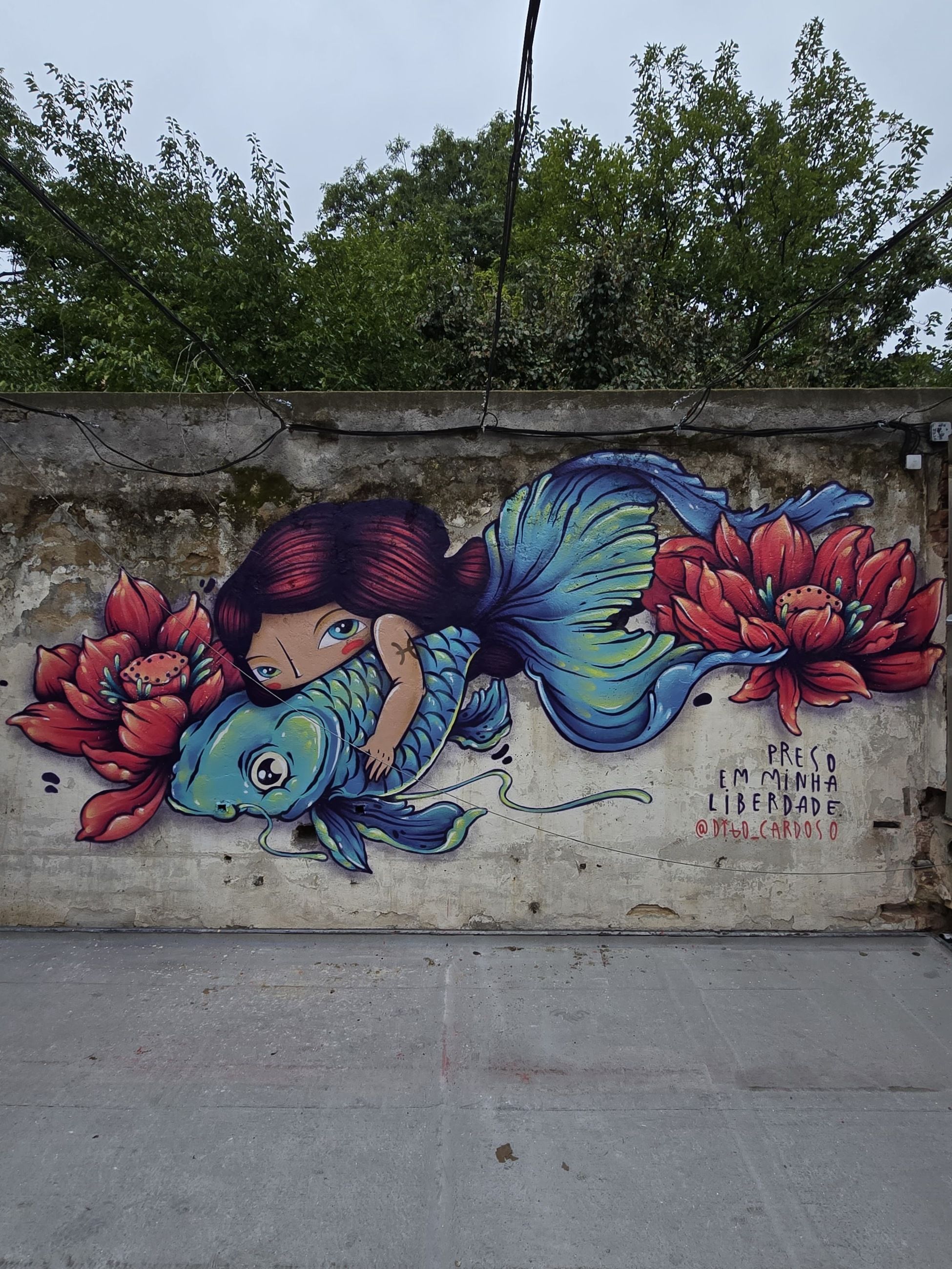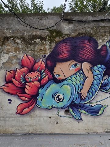 Jeho mural vytvořený pro Vnitroblock proměnil pražskou uličku v barevný a snový svět. Zobrazuje dívku jedoucí na velké modré rybě, obklopenou růžovými květy – symboly fantazie, jemnosti a života. Na těle dívky se objevuje znak ryb, znamení, které v sobě nese citlivost, intuici a hloubku.