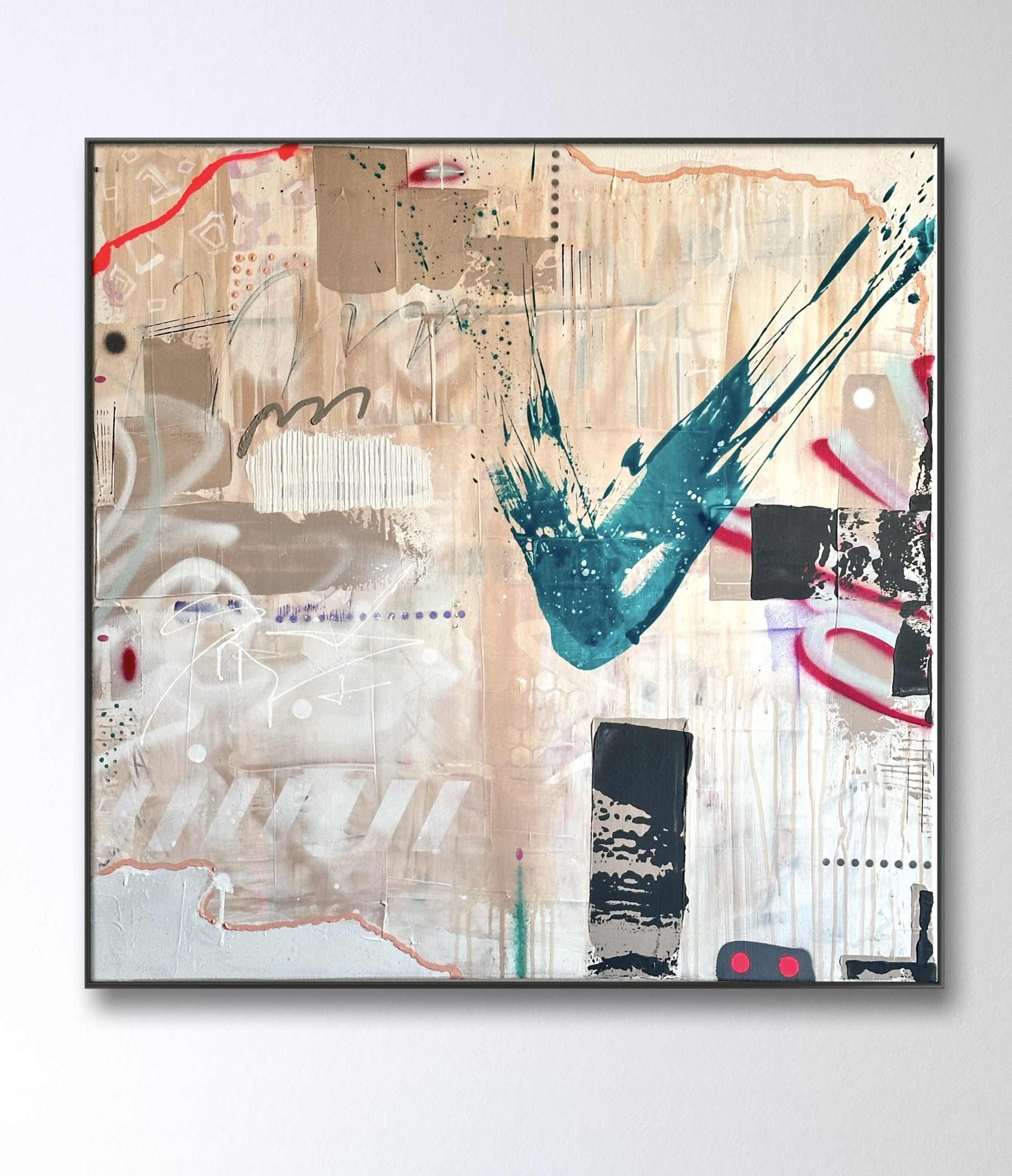 Inspiraci Tomáš čerpá z okolního prostředí: z městských struktur, náhodných vizuálních situací a detailů, které běžně míjíme bez povšimnutí. Rozlitá káva, potrhaný plakát, struktura zdi nebo rytmus hudby. Tyto fragmenty se v jeho obrazech proměňují v abstraktní kompozice, které působí chaoticky, a přesto vyváženě a klidně.